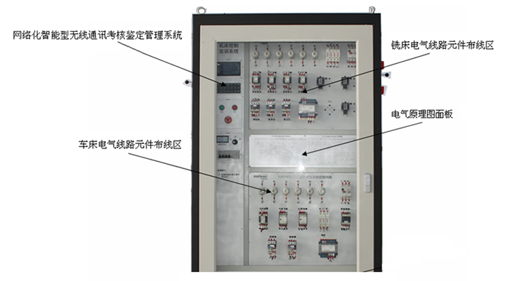 技能實(shí)訓(xùn)考核柜 四個(gè)機(jī)床操作按鈕及機(jī)床指示區(qū)面板 四個(gè)機(jī)床電氣線路元器件布線區(qū) 兩個(gè)機(jī)床轉(zhuǎn)接模塊區(qū) 網(wǎng)絡(luò)化智能型機(jī)床實(shí)訓(xùn)考核鑒定管理系統(tǒng) |