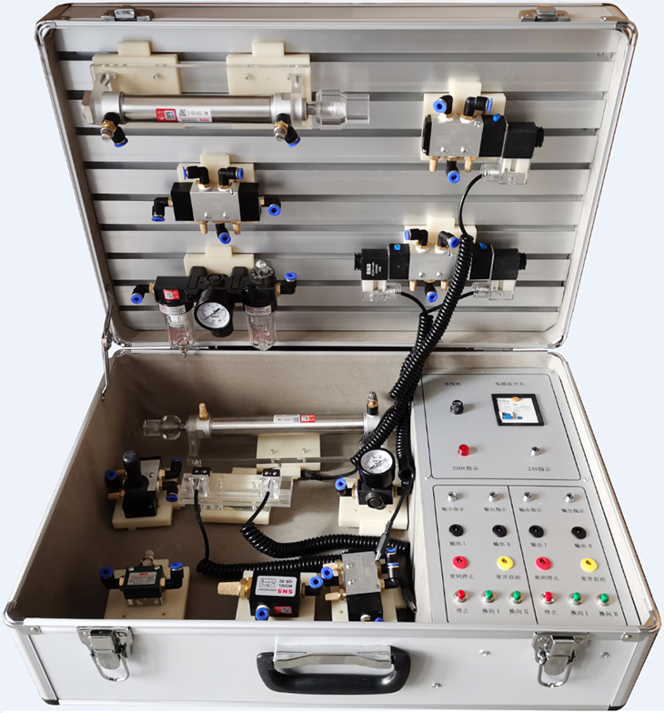 便攜式氣動傳動基礎(chǔ)實訓(xùn)箱, 氣動實驗箱是根據(jù)《液壓與氣壓傳動》、《氣動控制技術(shù)》等,是我公司根據(jù)各大專院校機(jī)電一體化對氣、電、液控制的教學(xué)大綱要求,氣動與繼電器控制實訓(xùn)設(shè)備的優(yōu)點,采用了開放型綜合實訓(xùn)箱結(jié)構(gòu),使氣動原理與自動控制理論得到有效的運(yùn)用,廣泛征求專家教授與老師的意見,經(jīng)不斷創(chuàng)新改進(jìn)研制而成。
