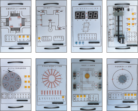 演示裝置上對(duì)PLC的輸入輸出均采用24V電源,5V電源供執(zhí)行機(jī)構(gòu)中的外圍使用,每套演示裝置主要由十七塊實(shí)驗(yàn)掛箱組成,它們的型號(hào)分別為: