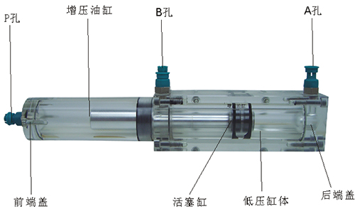 2、增壓油缸的前端、后端蓋、低壓缸體、增壓缸體等均采用了進口透明有機玻璃材料精制而成,透明清晰,活塞桿采用了合金鋁材料,并配合油接頭,密封圈,內(nèi)六角螺絲等標準件裝配而成,通過它可明確地觀察到活塞桿,油封,油孔等結(jié)構(gòu)及其運行過程,具有形象逼真,性能可靠等優(yōu)點,它既可作為教學模型,也可以液壓實驗元件進行實驗演示。