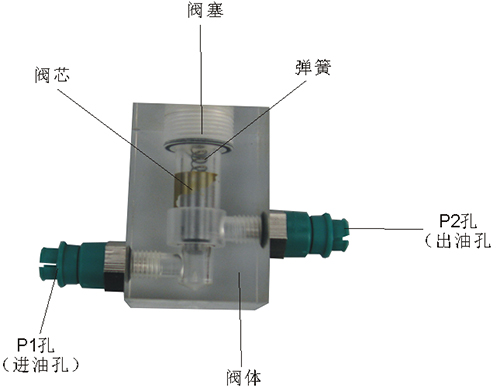 2、單向閥結(jié)構(gòu)上參考了國產(chǎn)I--63B型板式單向閥,其閥體,螺塞等采用了進口透明有機玻璃材料精制而成,閥芯采用了45#中碳鋼材料,并配合彈簧,油接頭,密封圈等標準件裝配而成,通過它可明確地觀察到活塞、彈簧、油孔等結(jié)構(gòu)及其運行過程,具有形象逼真,性能可靠等優(yōu)點。它即可作為教學模型,也可以作為液壓實驗元件進行實驗演示。