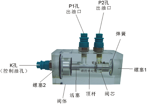 2、液控單向閥結(jié)構(gòu)上參考了國產(chǎn)IY-25B型液壓單向閥,其閥體、螺塞等采用了進口透明有機玻璃材料精制而成,閥芯、頂桿采用了45#中碳鋼材料,并配合彈簧,油接頭,密封圈等標準件裝配而成,通過它可明確地觀察到活塞、彈簧、油孔等結(jié)構(gòu)及其運行過程,具有形象逼真,性能可靠等優(yōu)點。它即可作為教學模型,也可以作為液壓實驗元件進行實驗演示。