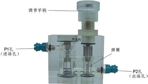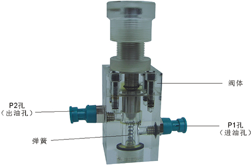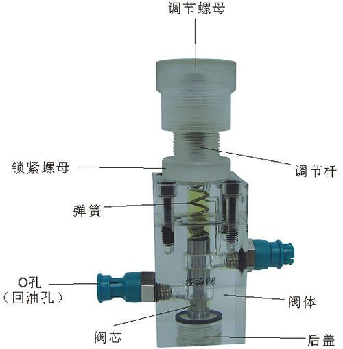 2、溢流閥結(jié)構(gòu)上參考了國產(chǎn)P-63B型低壓直動式溢流閥,其閥體閥蓋、鎖緊螺母、調(diào)節(jié)螺母、螺塞等采用了進口透明有機玻璃材料精制而成,閥芯、調(diào)節(jié)桿采用了45#中碳鋼材料。并配合彈簧,油接頭,密封圈等標準件裝配而成,通過它可明確地觀察到閥芯、彈簧、油孔等結(jié)構(gòu)及其運行過程,具有形象逼真,性能可靠等優(yōu)點。它即可作為教學模型,也可以作為液壓實驗元件進行實驗演示。