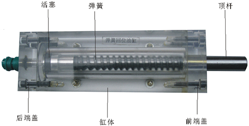 2、彈簧回位油缸的缸體,端蓋等均采用了進口透明有機玻璃材料精制而成,透明清晰,頂桿采用45#中碳鋼材料,并配合油接頭、密封圈、內(nèi)六角螺絲等標準件裝配而成,通過它可明確地觀察到活塞、頂桿、油封、油孔、彈簧等結(jié)構(gòu)及其運行過程,具有形象逼真,性能可靠等腰三角優(yōu)點,它即可作為教學模型,也可作為液壓實驗元件進行實驗演示。