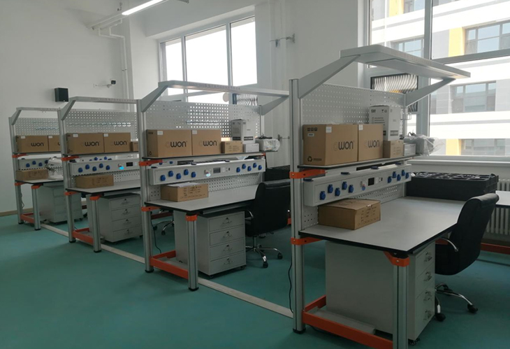 電子工藝實習(xí)室是供學(xué)生焊接練習(xí)、電子產(chǎn)品組裝調(diào)試操作的實驗室,學(xué)生進(jìn)行焊接操作。配備的儀器設(shè)備主要有直流穩(wěn)壓電源、示波器、萬用表、工具箱等。為了改善實習(xí)室的空氣環(huán)境衛(wèi)生,還專門配備了抽風(fēng)系統(tǒng)。開設(shè)的課程有《電子工藝實習(xí)》、《電工實習(xí)》,包括電路元件的選配、電子產(chǎn)品的安裝、焊接和性能測試等環(huán)節(jié)。電子工藝實驗實訓(xùn)室設(shè)備主要面向汽車、機械、電信、電氣、計算機、經(jīng)濟、管理等學(xué)院的學(xué)生,培養(yǎng)學(xué)生的動手實踐能力、分析問題和解決問題的能力以及創(chuàng)新精神。