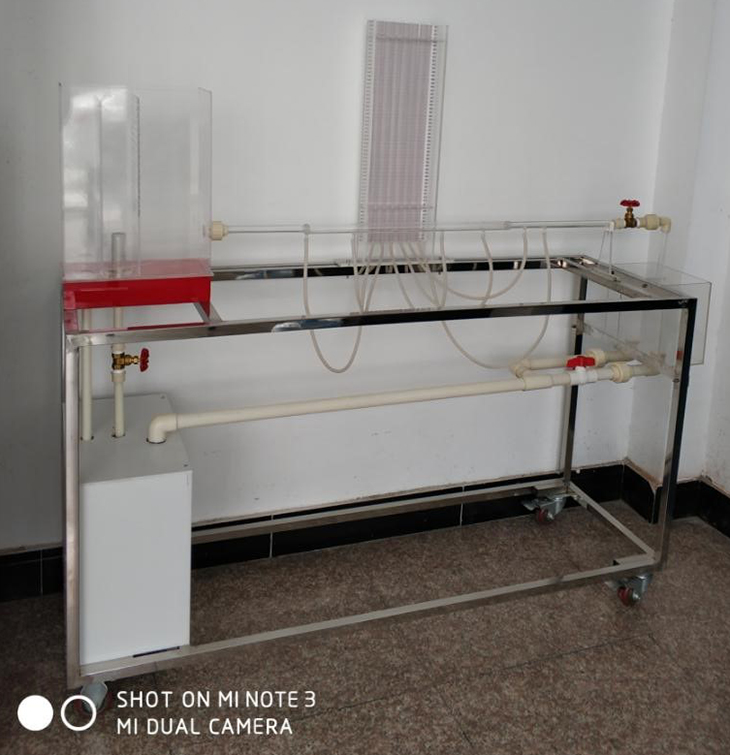 儲水箱、上水管、溢流管、整流柵、溢流板、溢流箱、取壓管、閥門、測壓板、回水箱、計量箱、回水管;移動式不銹鋼實驗臺;